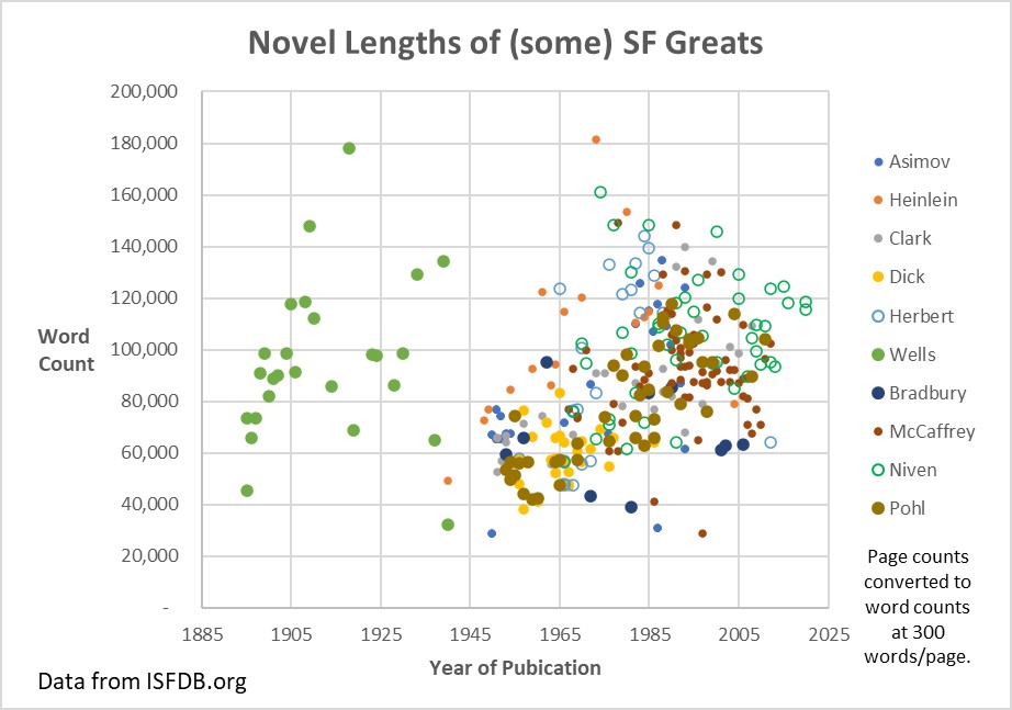 When I have the time, I plan to go back and add more early 20th century authors (say Edgar Rice Burroughs and AE Van Vogt). It’s bad practice to rely on only one source of data. And, august as HG Wells is, more writers would bridge the gap between his time and the post-world-war II science fiction era. Perhaps some surprises will present themselves. In addition, I am curious if the fantasy genre follows the same trends, or plows its own word count course. Expect more essays in this series.