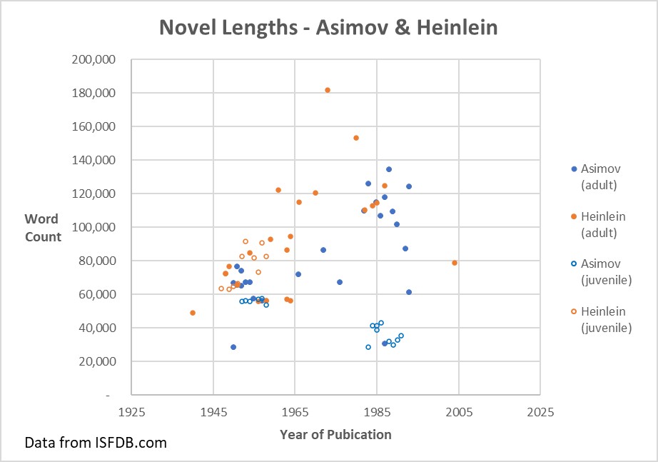The aggregate graph includes only adult novels. Both Asimov and Heinlein, however, are famous for a number of juvenile novels. Those are displayed as open (unfilled) data points, and are uniformly shorter than average in word count. I don’t have the data to back this up, but am under the impression that young adult novels these days are longer in comparison.