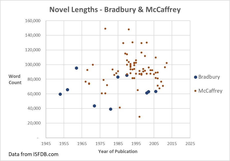 It came as a surprise to me how few actual novels Ray Bradbury wrote, considering the influence he exerted over the genre. There’s no doubt the man was prolific. But much of his work took the form of short fiction and screenplays. Which likely influenced how long his novels were. That’s simply the way his muse chose to speak to him. In contrast, Anne McCaffrey’s muse must’ve had a lot to say. She published an impressive 69 novels, and they tended to north of 80,000 words.