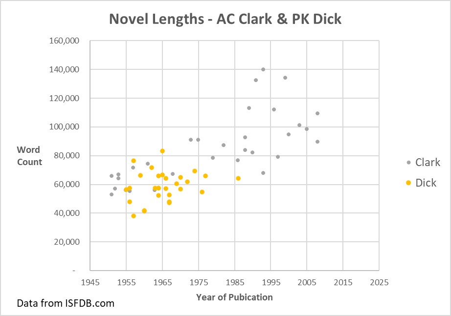 It’s interesting to compare the lengths of Authur C Clark’s and Philip K Dick’s novels. I was mildly surprised at the number pf PK Dick novels, having only been familiar with his later work. Those books dominate his canon. Both Clark and Dick are somewhat overrepresented in dramatic adaptations of their novels. PK Dick, in particular. All Dick novels are on the shorter side, and I wonder if that suits them to converting them to screenplays. If Philip K Dick had lived longer, would his books have trended longer? We’ll never know.