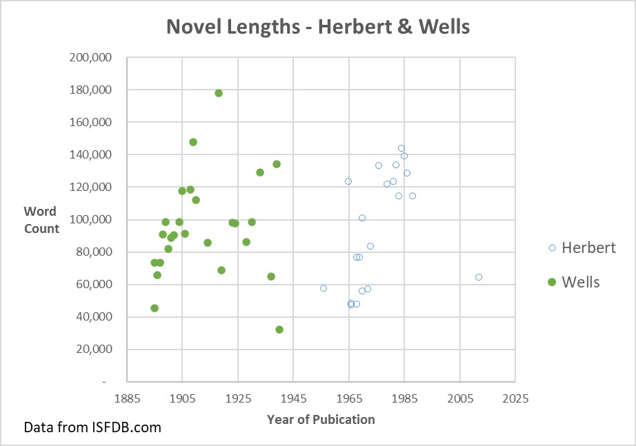 HG Wells and Frank Herbert hail from radically different eras, but their novel lengths spread over much the same spans.
