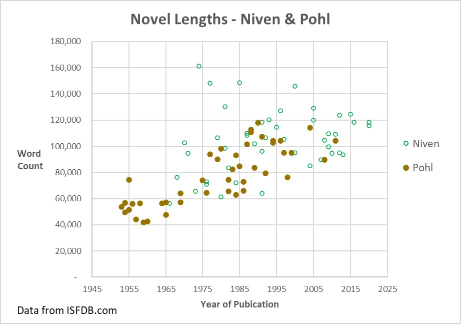 The writing careers of Larry Niven and Frederik Pohl overlap to a large extent. Both rode the upward drift in novel lengths, leveling out once the trend seems to start down again after the turn of the 20th/21st century.