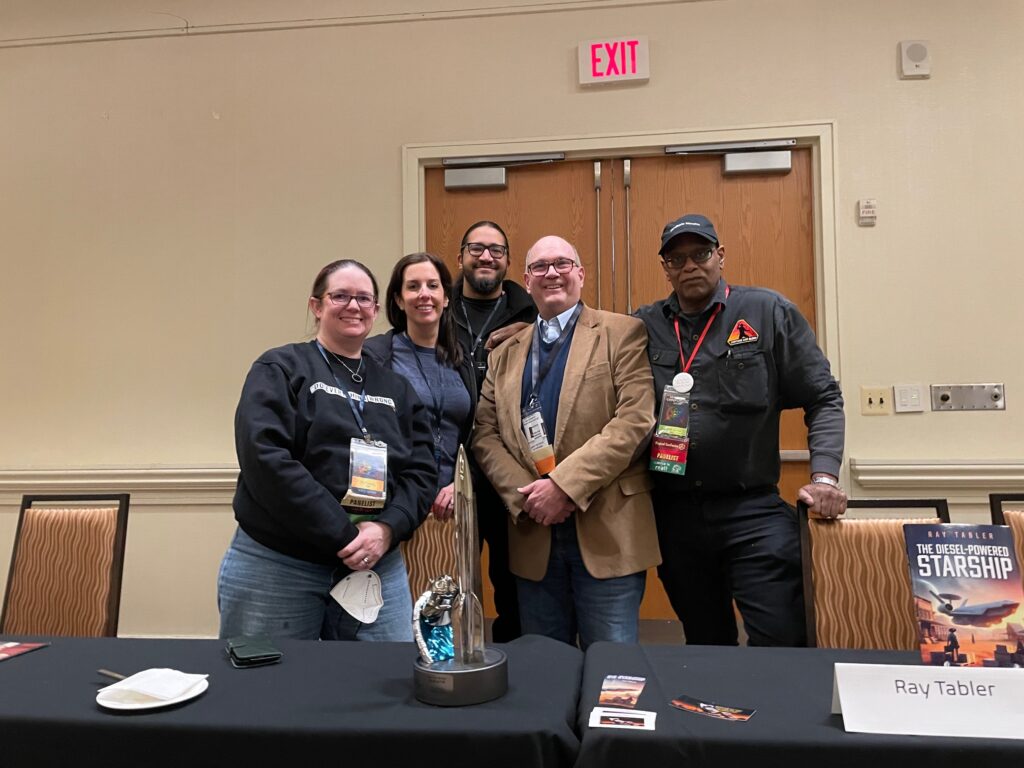 At Confusion, right after a panel on “Are Podcasts/YouTube the Next Fanzines?” with co-panelists Mur Lafferty, Christine Daigle, BluRaven Houvener, and Chris M. Barkley (left to right), all of us gathered around Chris Barkley’s prodigal Hugo Award.